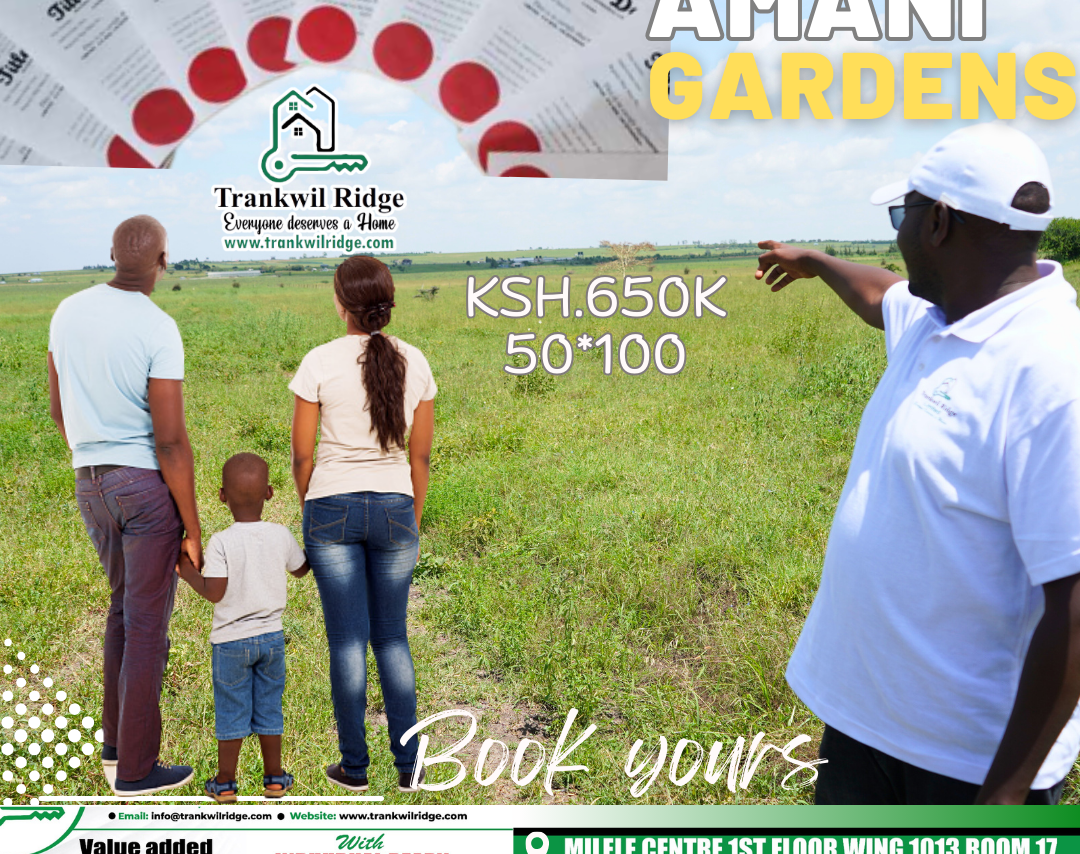 • Adjacent to the Isinya Airstrip is the serene and picturesque Trankwil Ridge Amani Gardens. This development offers prime residential plots at an attractive price of Ksh. 650,000, making it an ideal location for those seeking a peaceful yet accessible place to live.